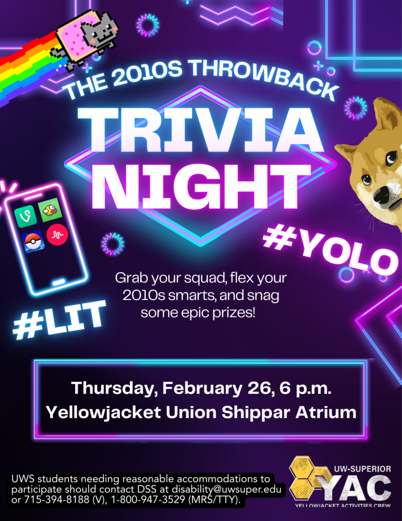 Throw it back to the 2010s! Get ready to vibe with the best of the 2010s at Throwback Trivia Night! Join us on Thursday, February 26th, at 6 p.m. in the
