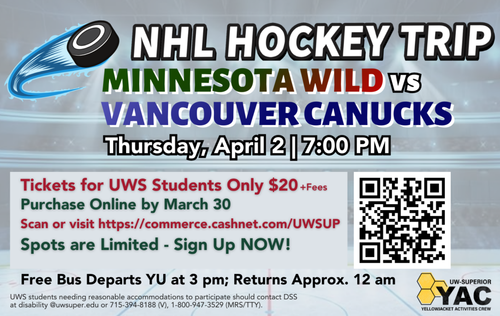 Join fellow UW–Superior students for an exciting night of NHL action as the Minnesota Wild take on the Vancouver Canucks! On Thursday, April 2nd at 7:00 PM, cheer on the Wild