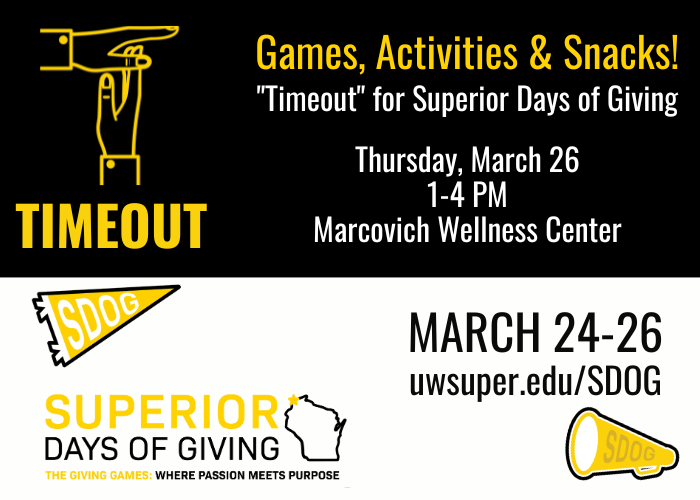 Come take a break and celebrate the last day of Superior Days of Giving! The Alumni & Friends Foundation is teaming up with the Marcovich Wellness Center (MWC) and Campus Recreation to offer this fun event. There will be games, activities, and snacks. Drop in anytime from 1 to 4 pm!